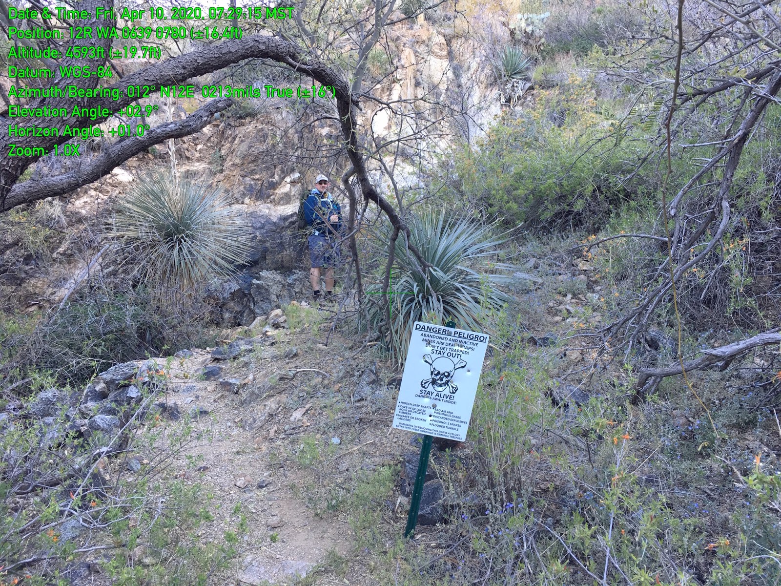 Some advice here. You are about to drop down a steep trail some 500', loose rock, narrow, cactus, shin daggers, century plants and a large number of chances for a serious injury. Once at the bottom you have to work your way up the other side of the canyon on a trail that is maybe half as nice as this one.